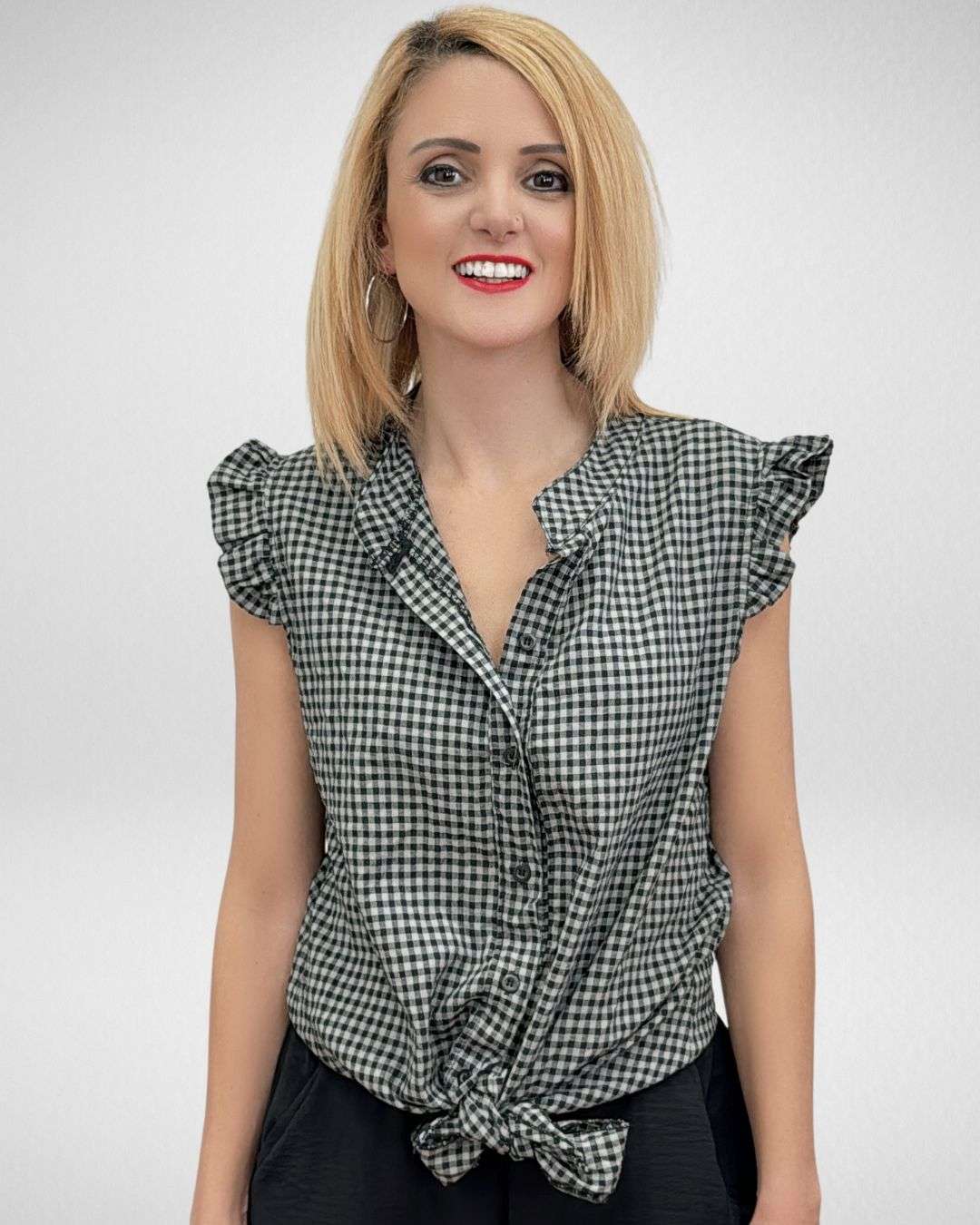 Αμάνικο πουκάμισο σε διακριτικό καρό σχέδιο και μοντέρνο φραμπαλά στο μανίκι.