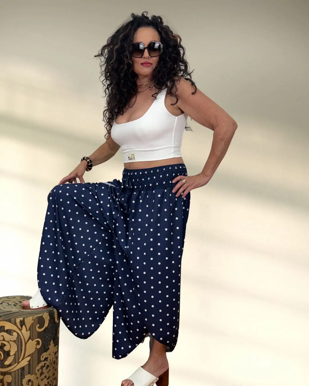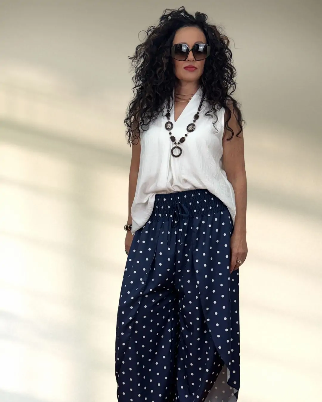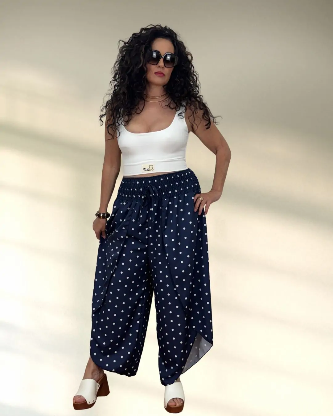 Καλοκαιρινή άνεση με πουά διάθεση Σαλβάρι-παντελόνα Oversized που αγκαλιάζει το σώμα απαλά και δίνει στυλ σε κάθε εμφάνιση.
