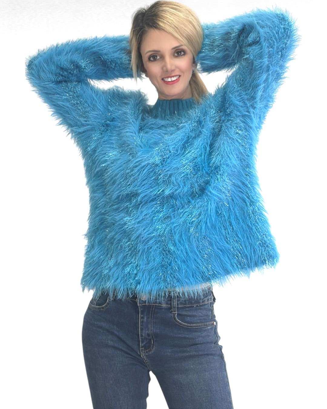 Χνουδωτό πουλόβερ με κρόσσια Μπλε fluffy
