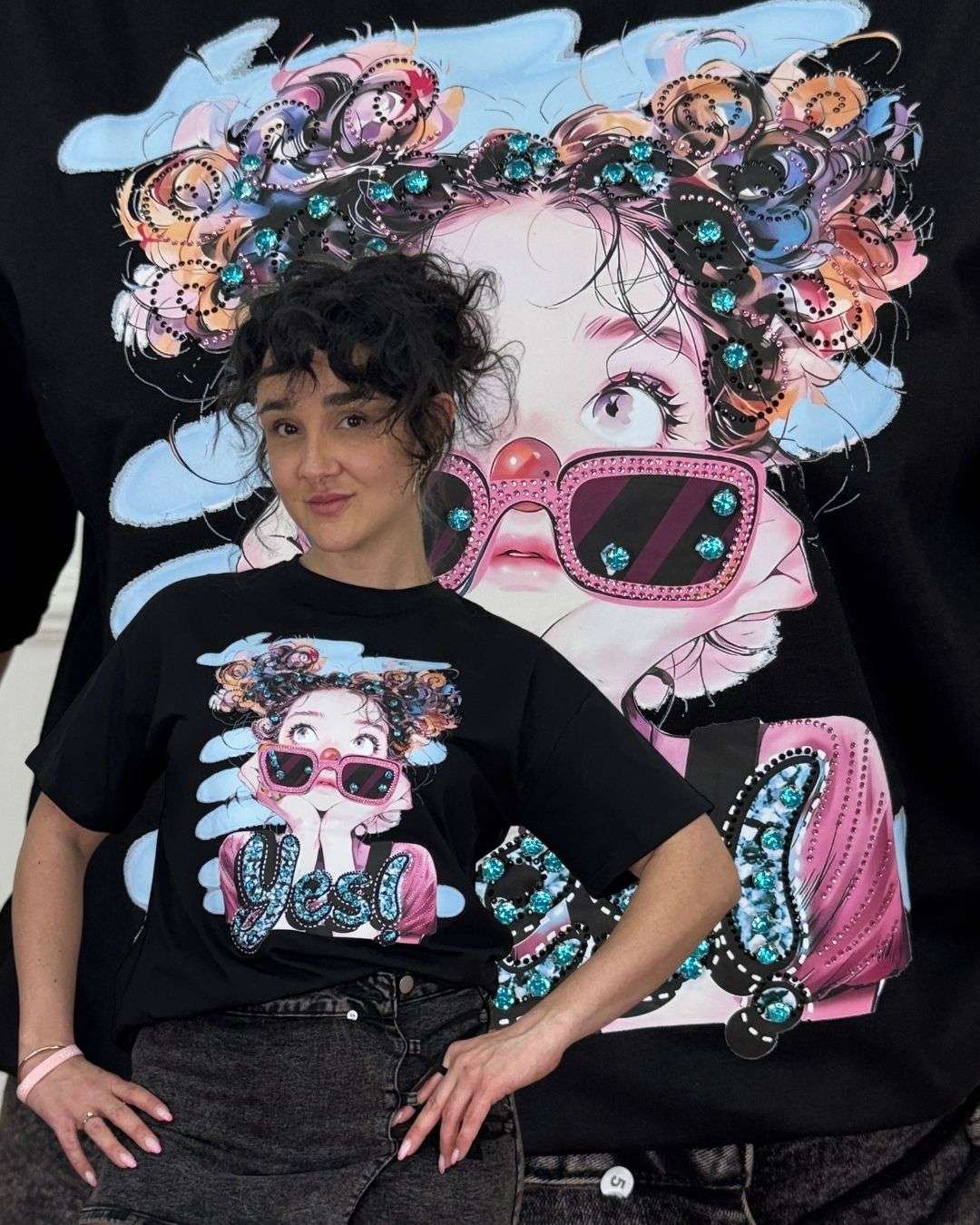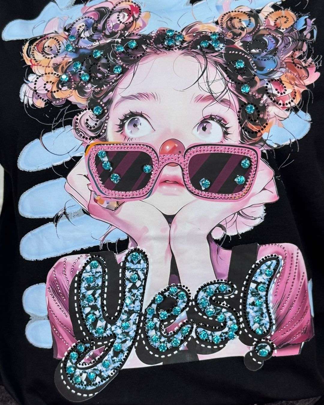 Διακοσμημένο με εντυπωσιακό τύπωμα “Cool girl” και λαμπερά strass που δίνουν ένα fashion και playful χαρακτήρα στο look.