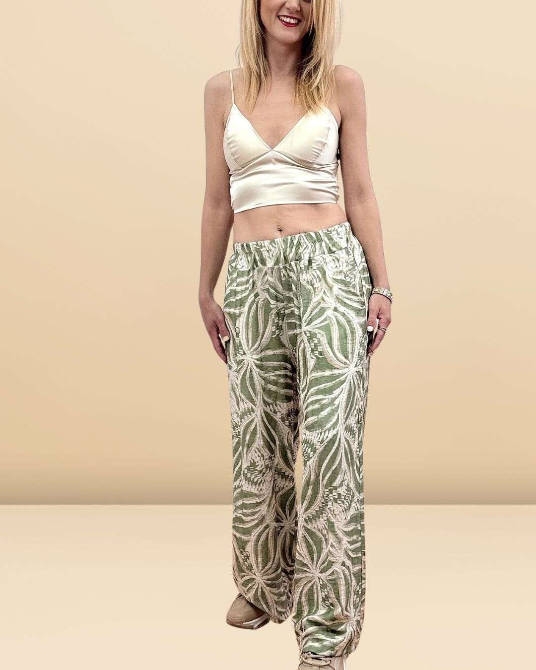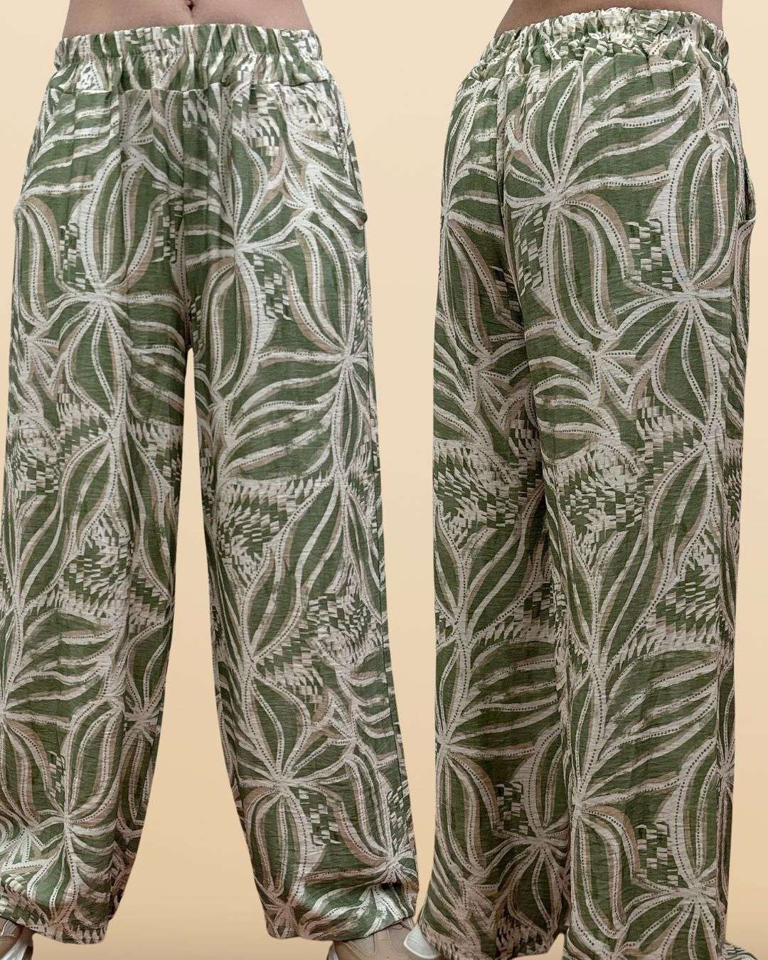 Μοντέρνα παντελόνα σε εμπριμέ σχέδιο (Λαδί ) με απαλούς τόνους, για τις καλοκαιρινές σας εξορμήσεις.