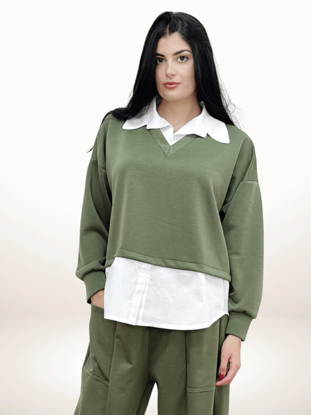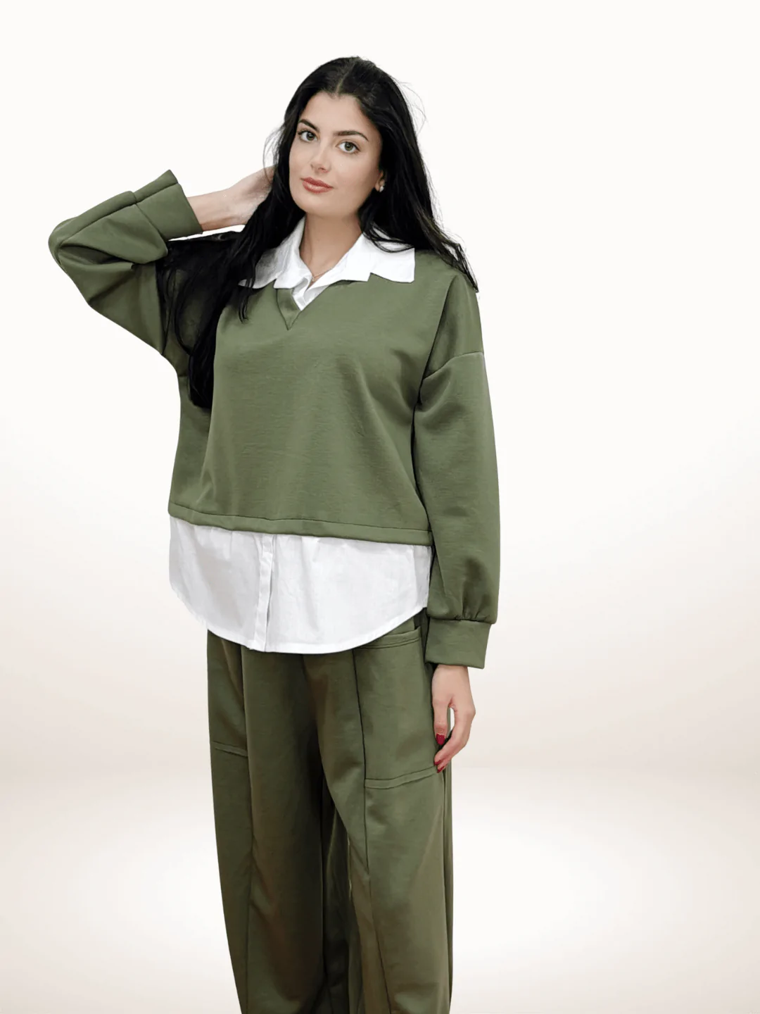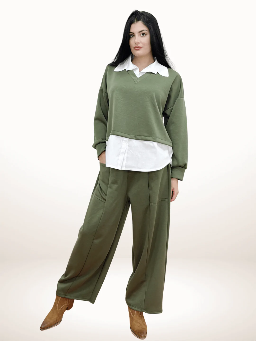 Γυναικείο Oversized Σετ Μπλουζοπουκάμισο με Παντελόνα Λαδί