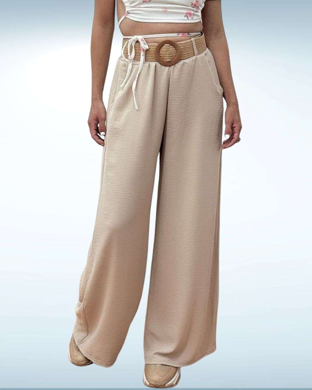 Κομψή-Άνετη Παντελόνα μονόχρωμη με ψάθινο ζωνάκι Μπεζ (Beige), που προσθέτει μια φυσική και κομψή πινελιά.