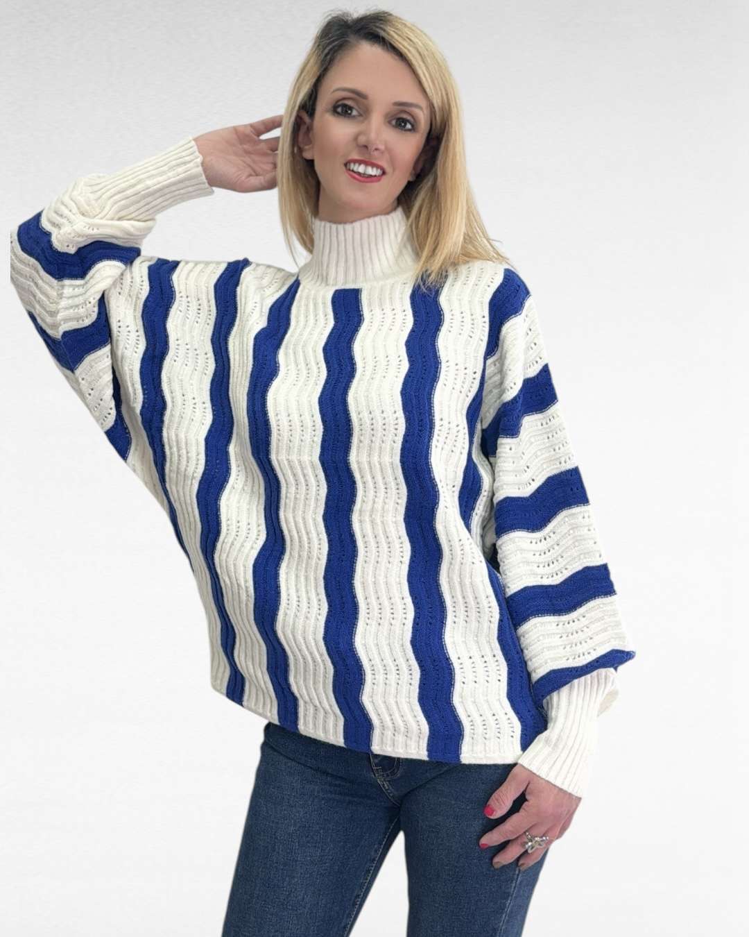 Ανακαλύψτε το κομψό λευκό πλεκτό πουλόβερ με μπλε κάθετες ρίγες, ιδανικό για να προσθέσετε μία αίσθηση φρεσκάδας και στυλ στο χειμερινό σας ντύσιμο. Το απαλό πλεκτό ύφασμα εξασφαλίζει άνεση και ζεστασιά, ενώ οι μπλε ρίγες προσφέρουν μια διαχρονική και μοντέρνα αντίθεση.