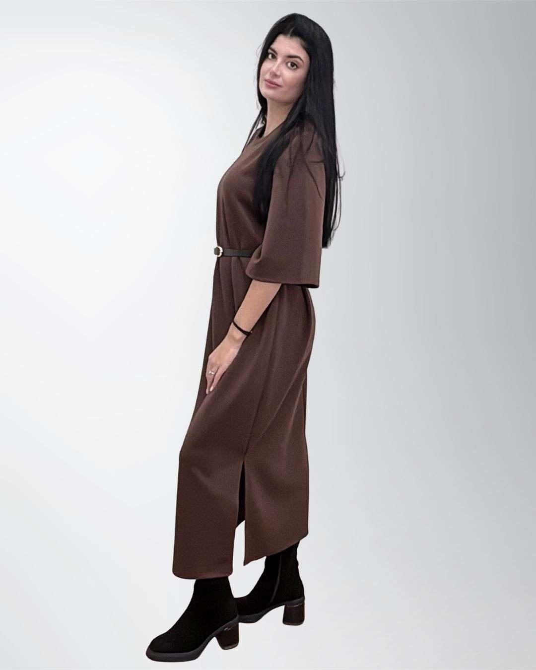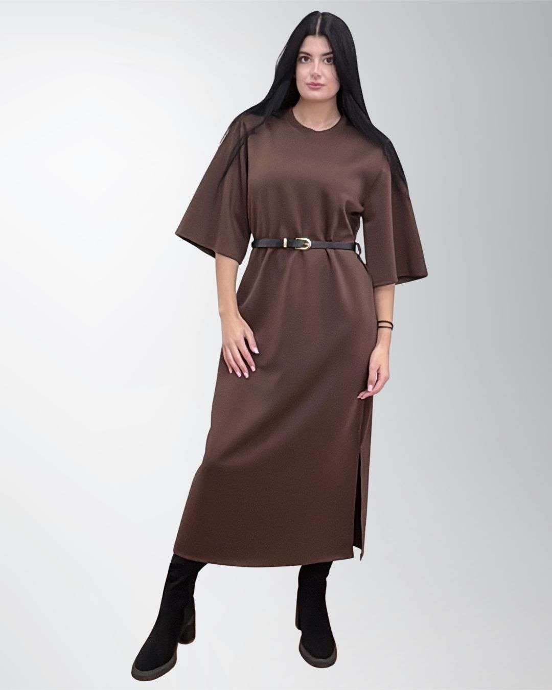 Κομψότητα σε μια κίνηση — μονόχρωμο μάξι φόρεμα, ζωνάκι στη μέση και ένα διακριτικό σχίσιμο που δίνει όλο το finesse.
