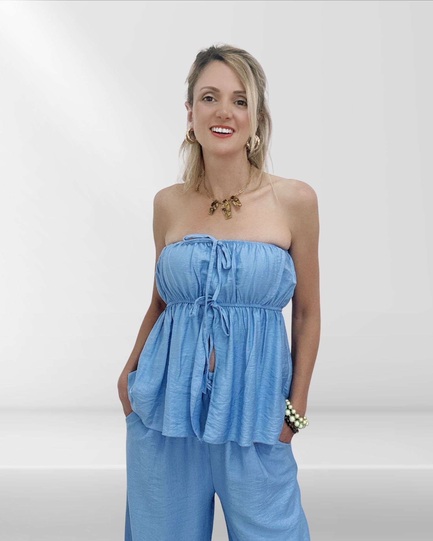 Άνετο και στιλάτο γυναικείο σετ με παντελόνι και στράπλες τοπ με λάστιχο, ιδανικό για καθημερινές ή καλοκαιρινές εμφανίσεις.
