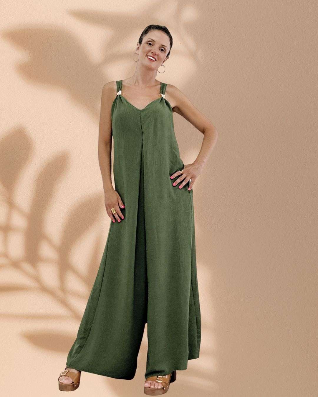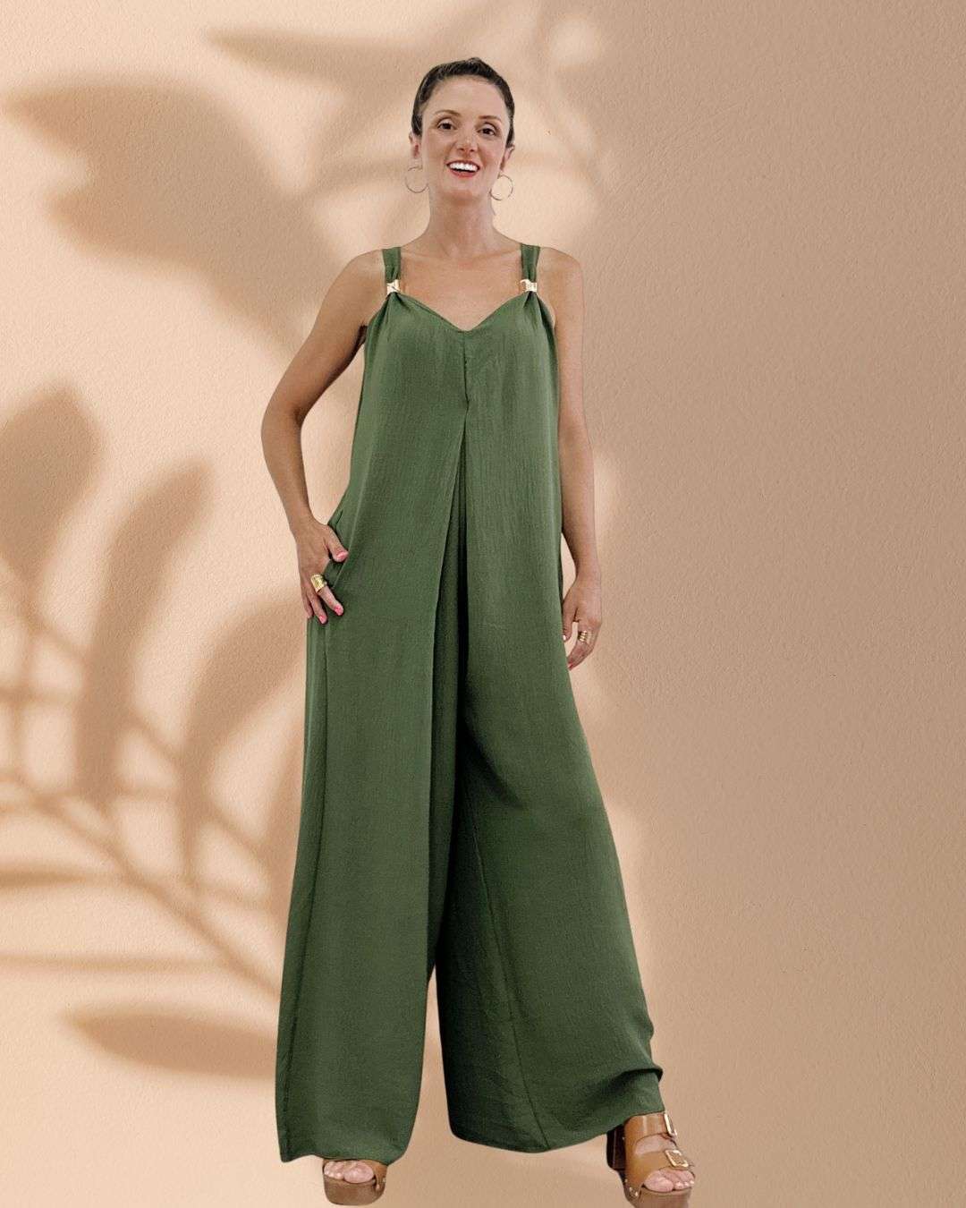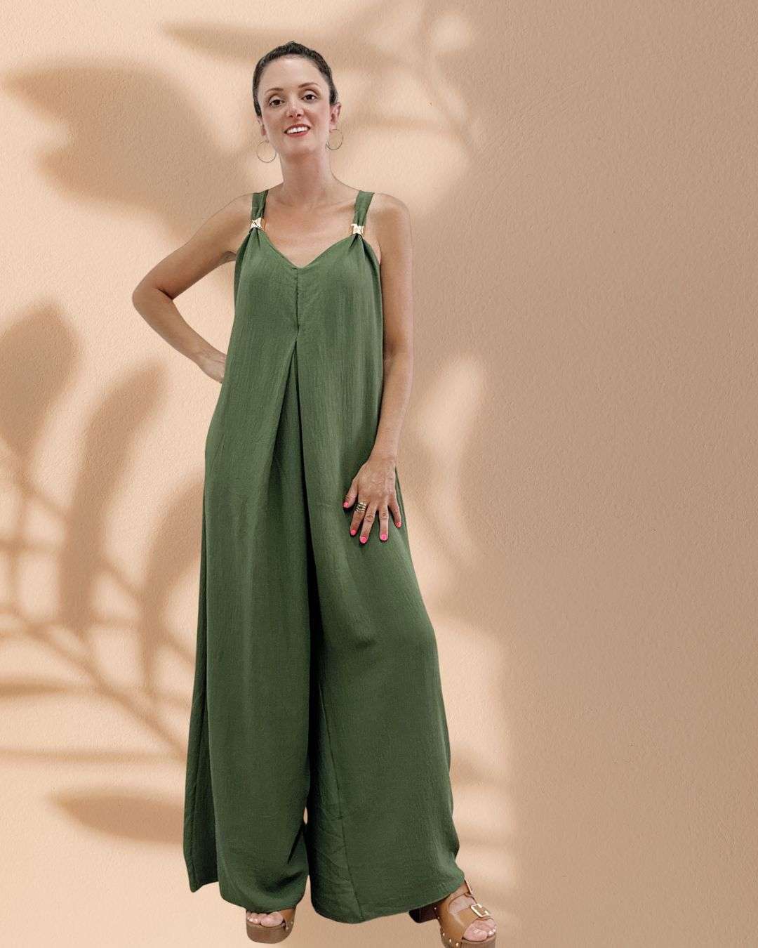 Όταν η άνεση συναντά τη λάμψη . Η χρυσή λεπτομέρεια στις τιράντες κάνει τη διαφορά σε αυτή τη φαρδιά ολόσωμη φόρμα που ταιριάζει τέλεια σε κάθε σωματότυπο.