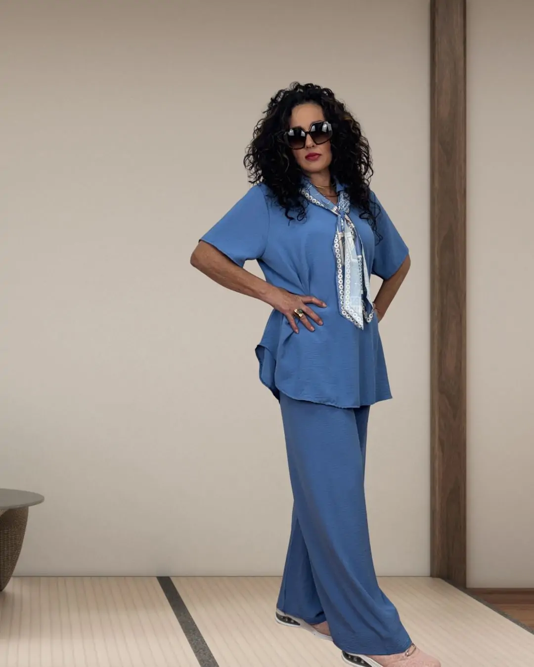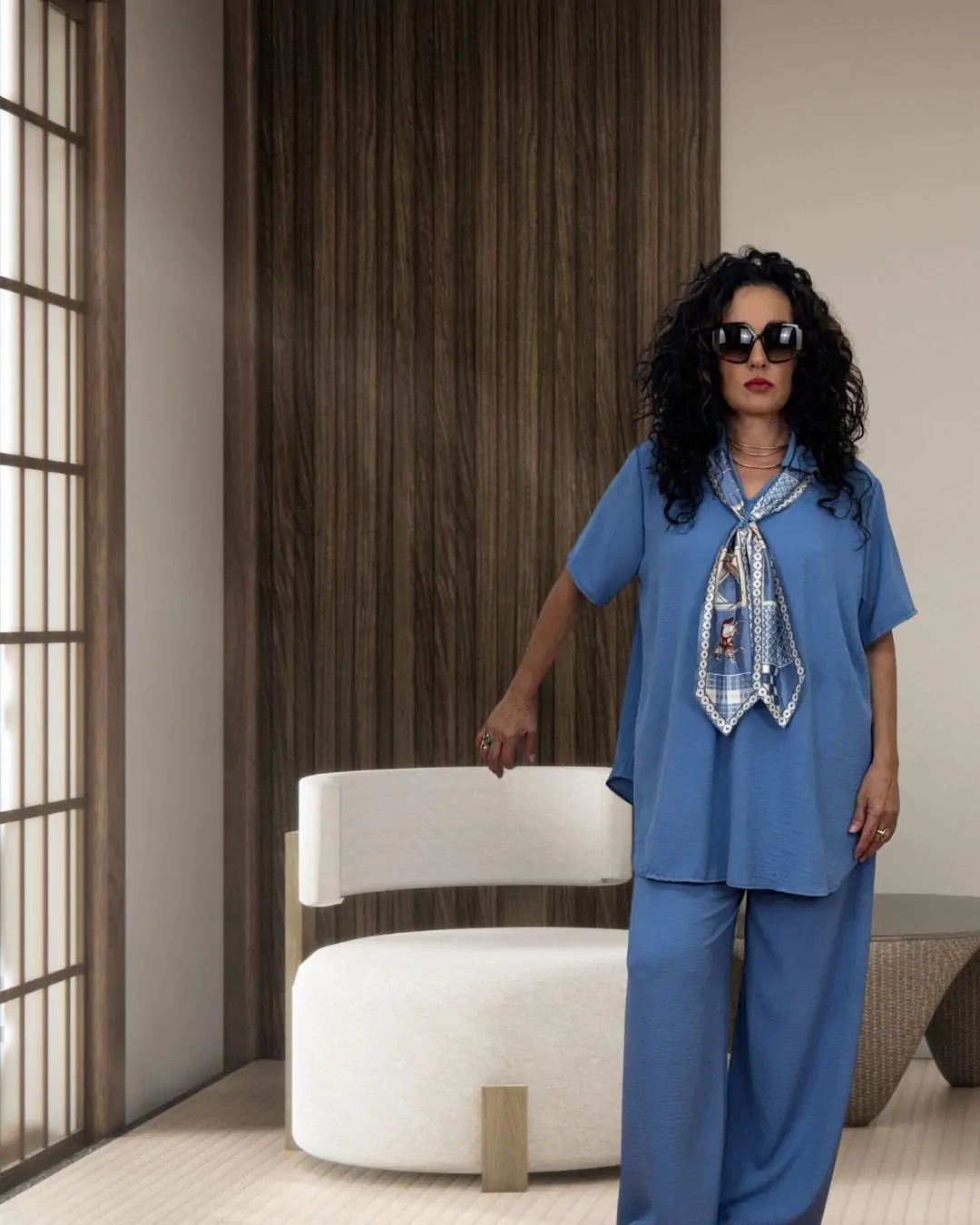 Η μπλούζα είναι μακριά με γιακά, χαρίζοντας ένα πιο προσεγμένο και elegant αποτέλεσμα, ενώ το επιπλέον σατέν μαντήλι στο λαιμό ολοκληρώνει το look με μια ιδιαίτερη λεπτομέρεια.