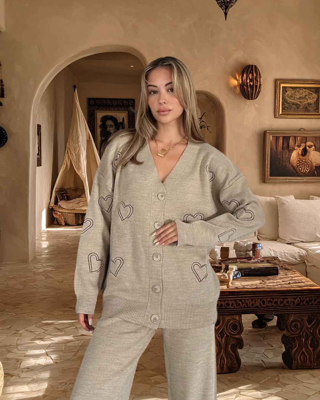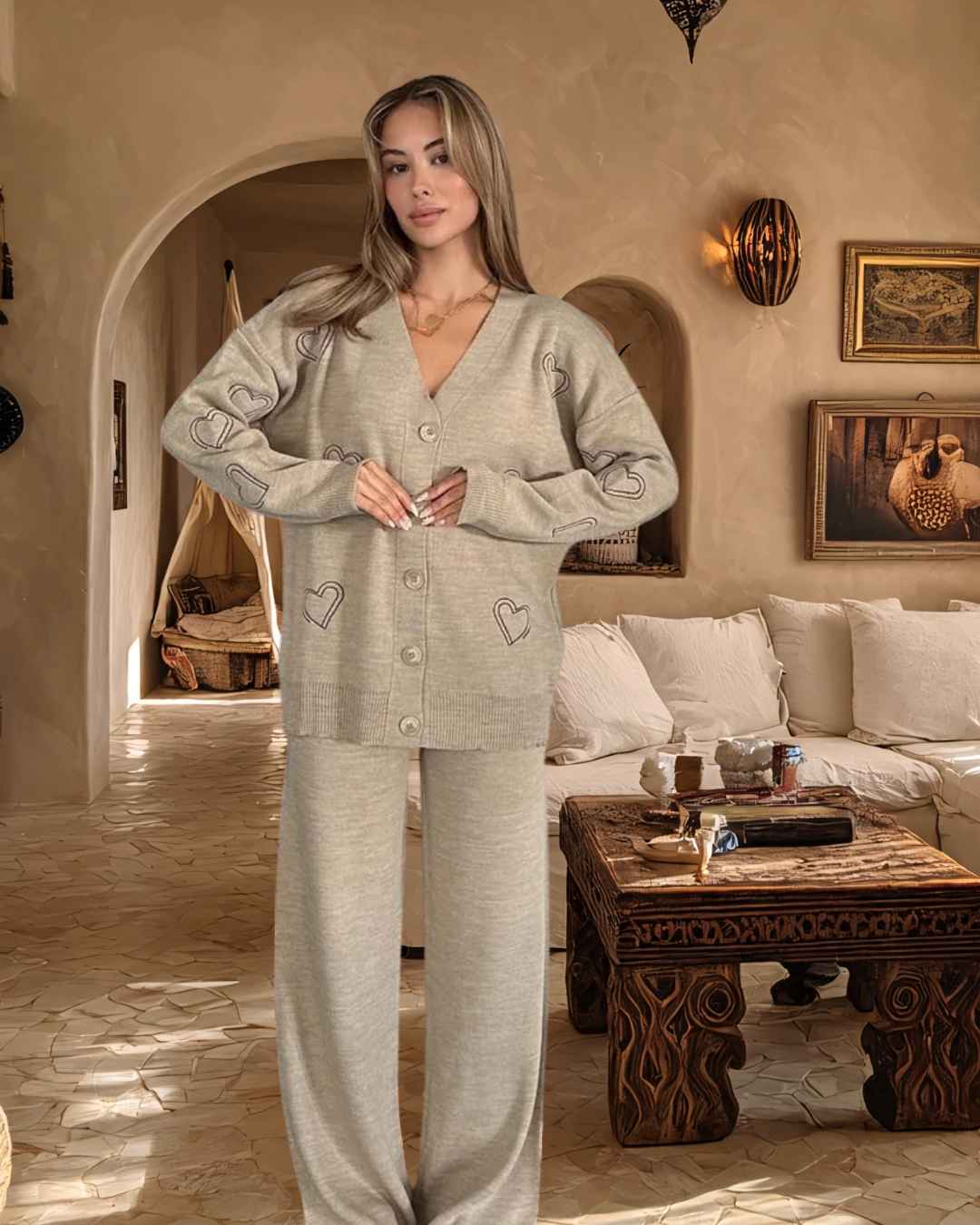 Ένα σετ που ξεχωρίζει χωρίς προσπάθεια — cozy πλέξη, cute κέντημα καρδιών και άνεση που δεν θες να βγάλεις. Το απόλυτο romantic-comfy vibe για κάθε μέρα.