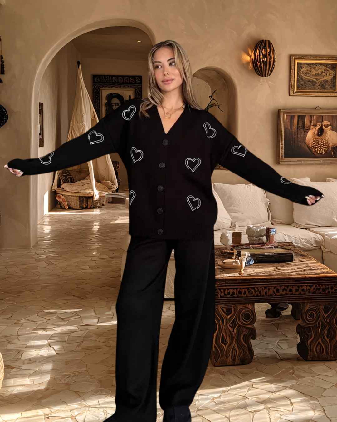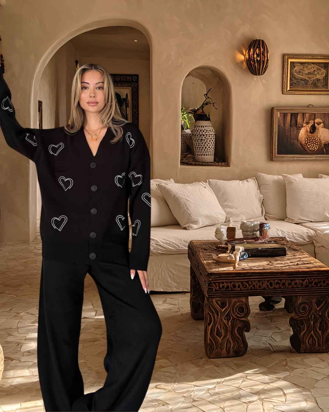 Ένα σετ που ξεχωρίζει χωρίς προσπάθεια — cozy πλέξη, cute κέντημα καρδιών και άνεση που δεν θες να βγάλεις. Το απόλυτο romantic-comfy vibe για κάθε μέρα.