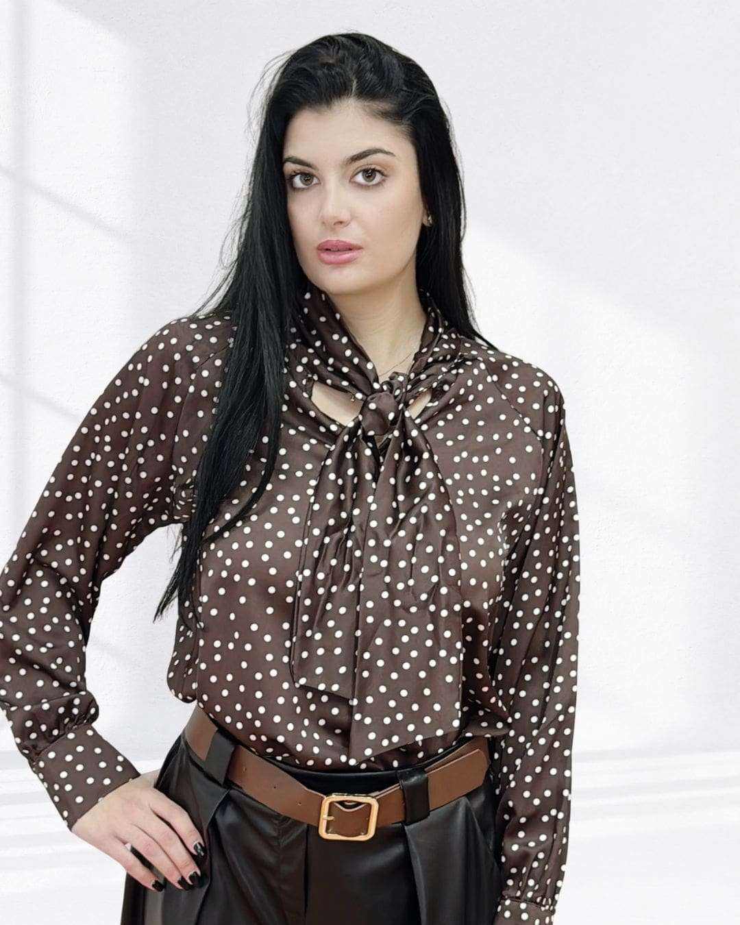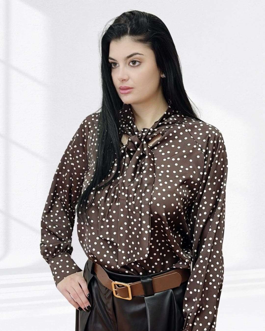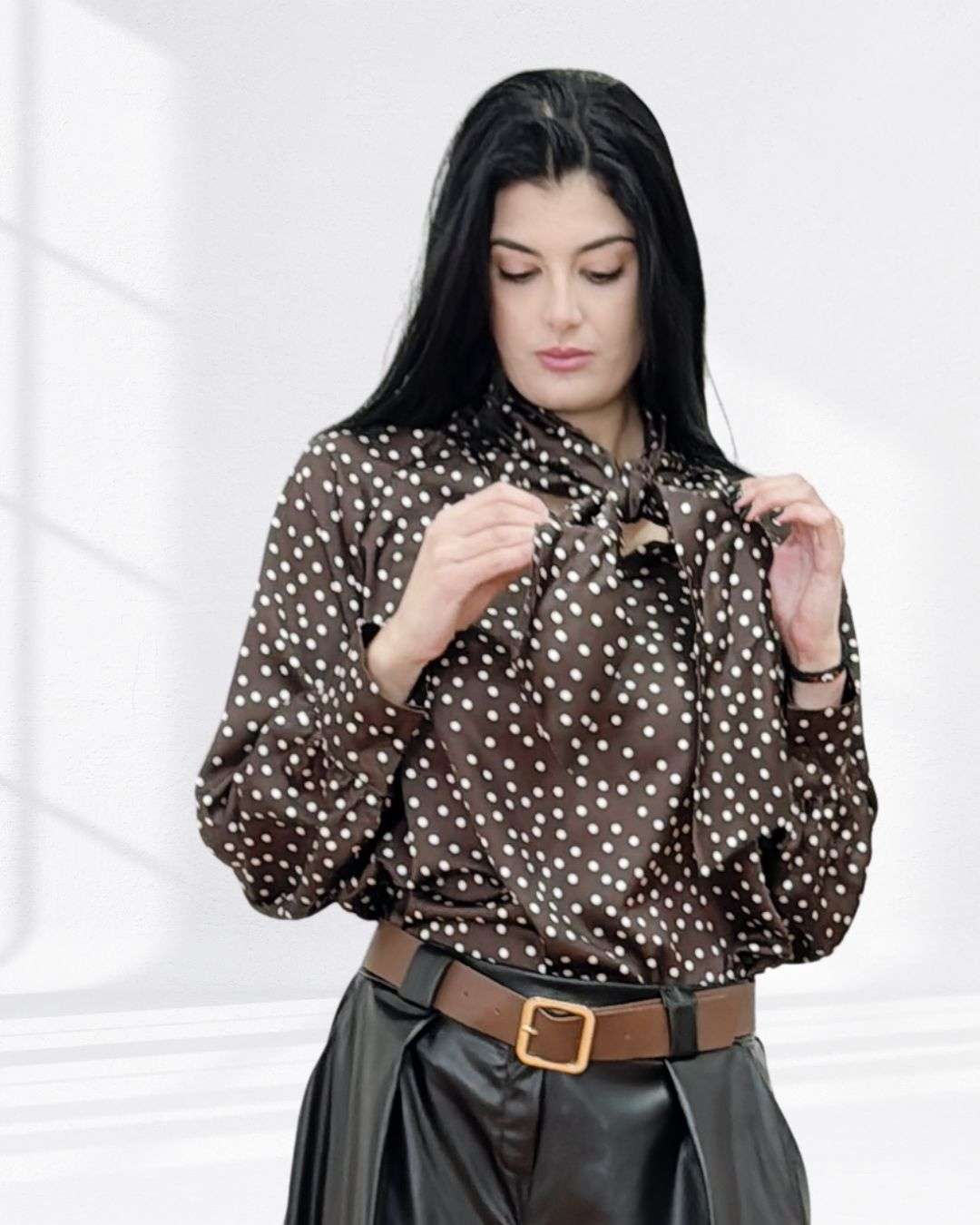 Πουά Μπλούζα με Μανσέτα & Γραβάτα-Φιόγκο Καφέ Σοκολά