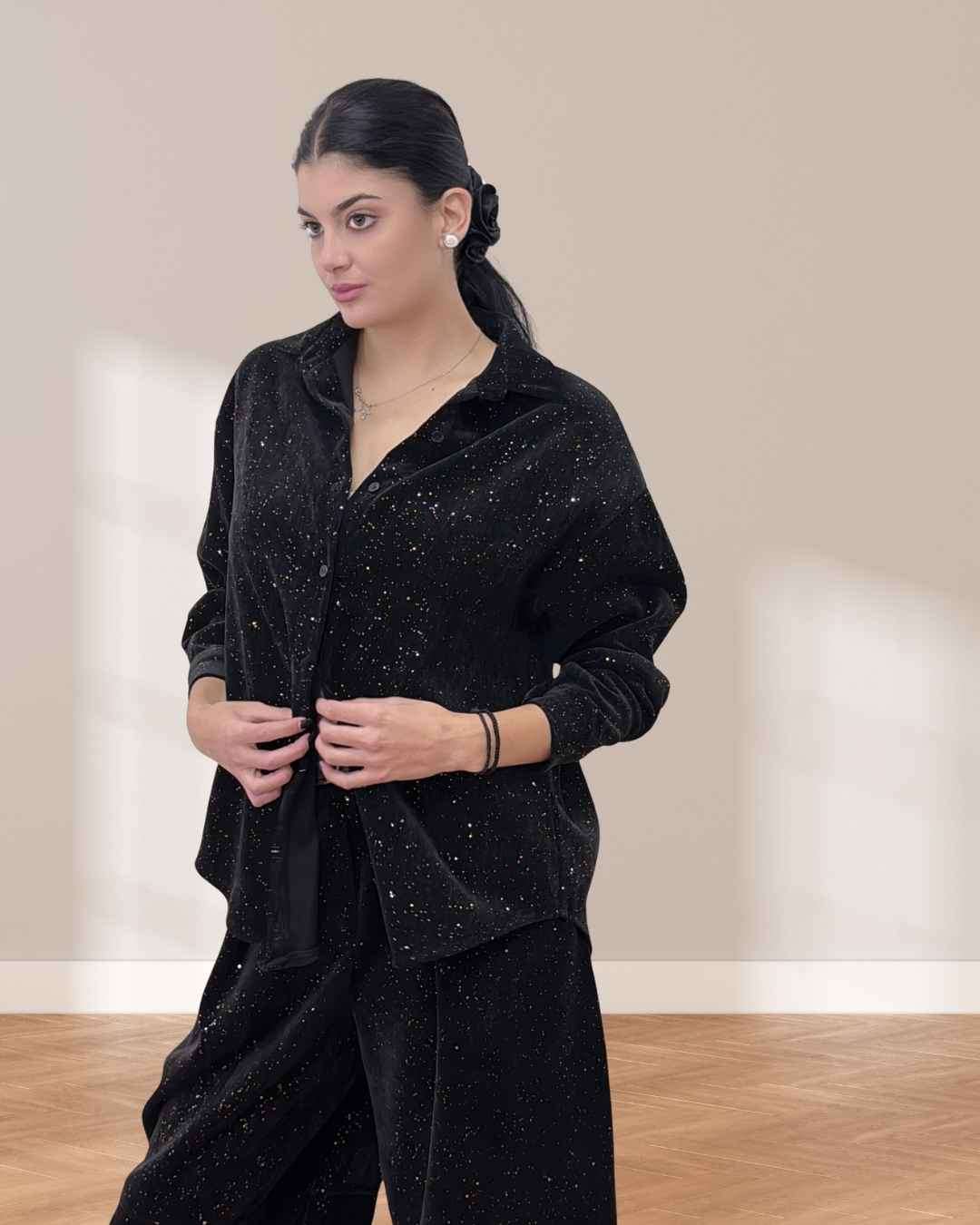 Κομψό σενίλ μαύρο πουκάμισο με strass λεπτομέρειες για λαμπερές και στιλάτες εμφανίσεις, ιδανικό για βραδινές εξόδους.