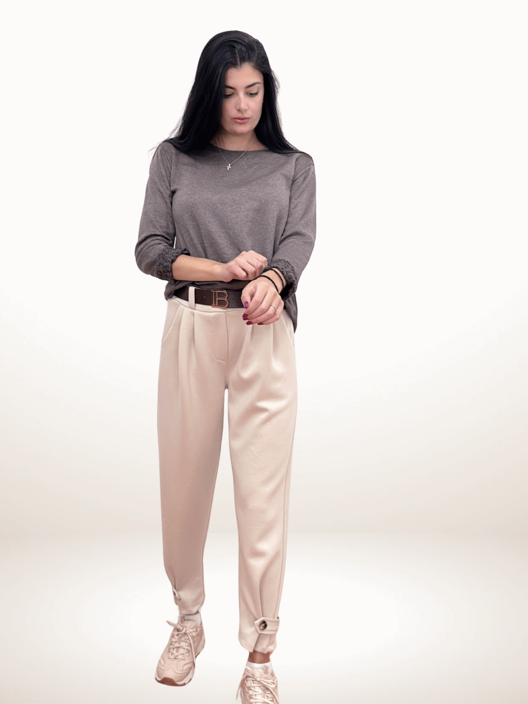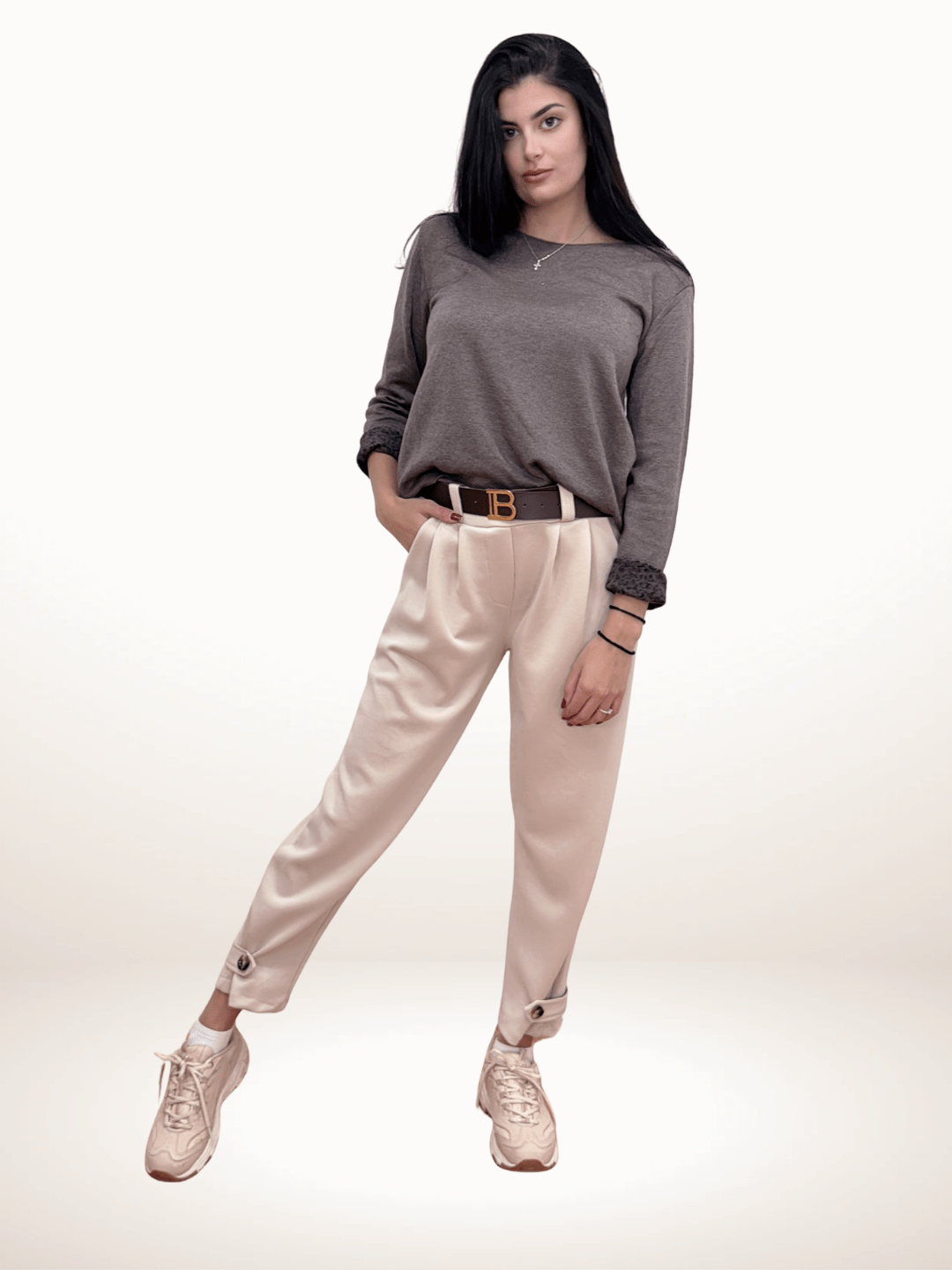 Το παντελόνι με ζώνη, τσέπες και ρυθμιζόμενο μπατζάκι συνδυάζεται με ένα απαλό πλεκτό μπλουζάκι στον ίδιο τόνο, δημιουργώντας ένα μονοχρωματικό look που αποπνέει κομψότητα. Ένα outfit που μπορείς να φορέσεις από το πρωί μέχρι το βράδυ, παραμένοντας άνετη & stylish.