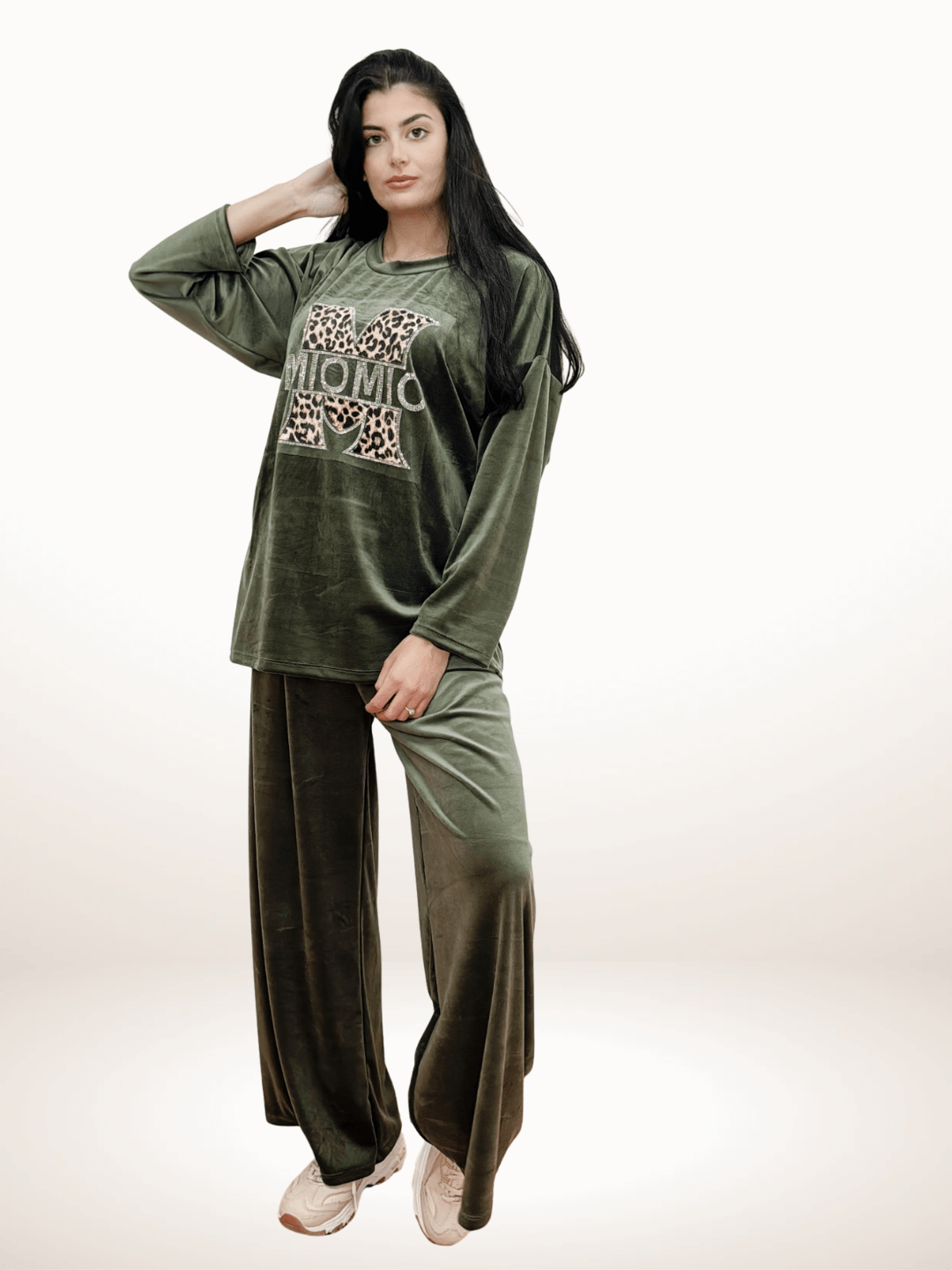 Βελουτέ Σετ Παντελόνι Μπλούζα με Κέντημα και Στρας Λαδί