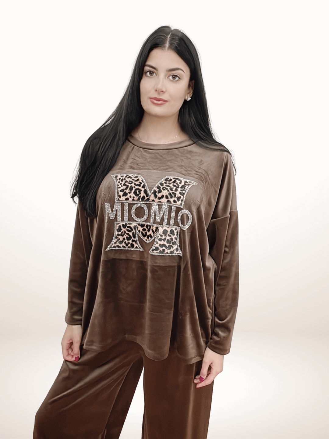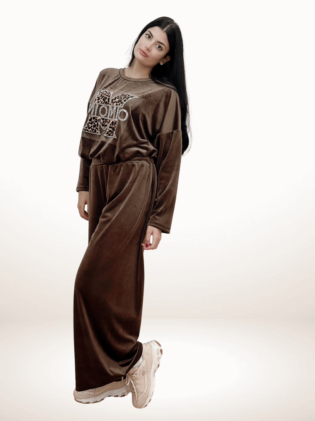 Βελουτέ Σετ Παντελόνι Μπλούζα με Κέντημα και Στρας Σοκολά