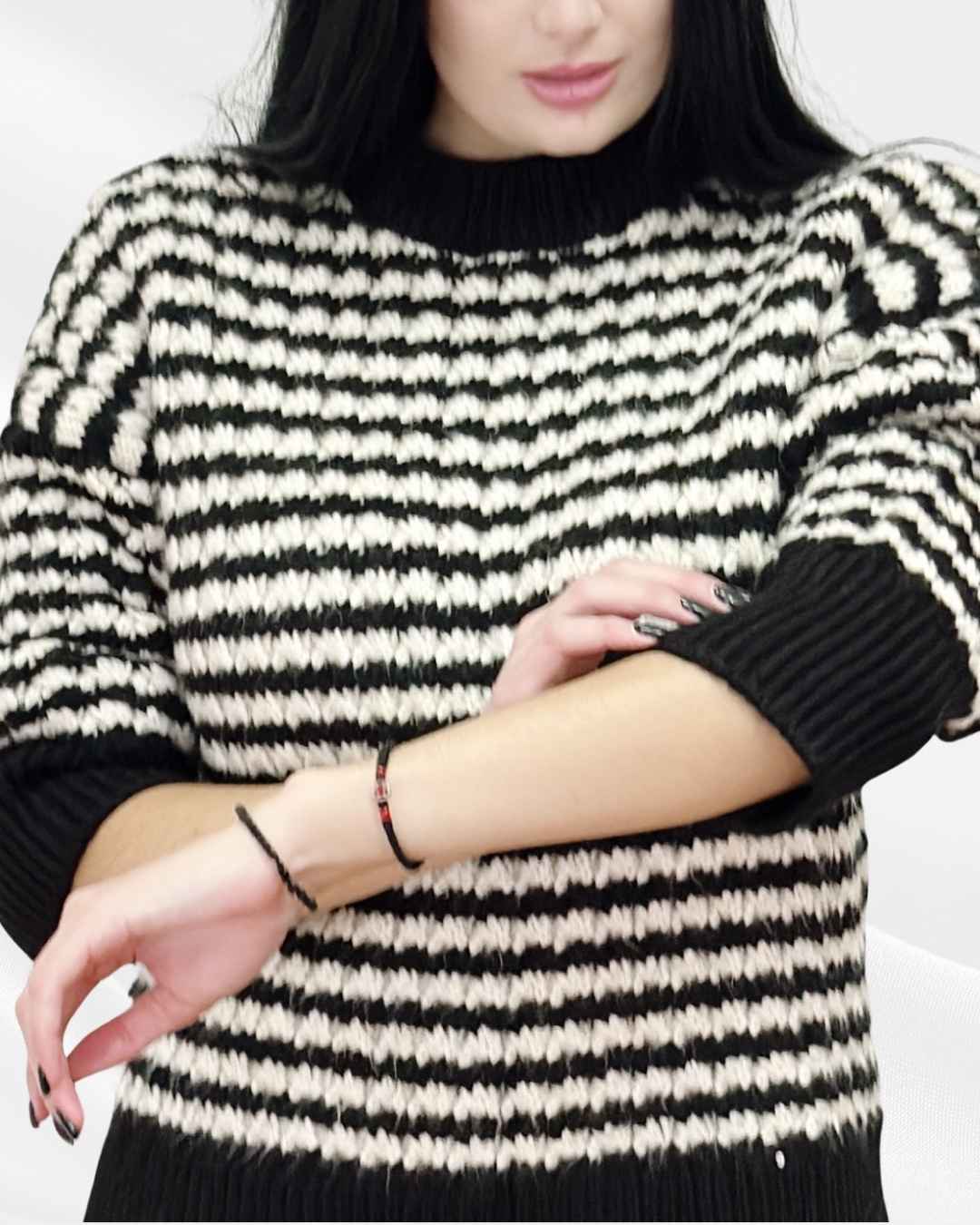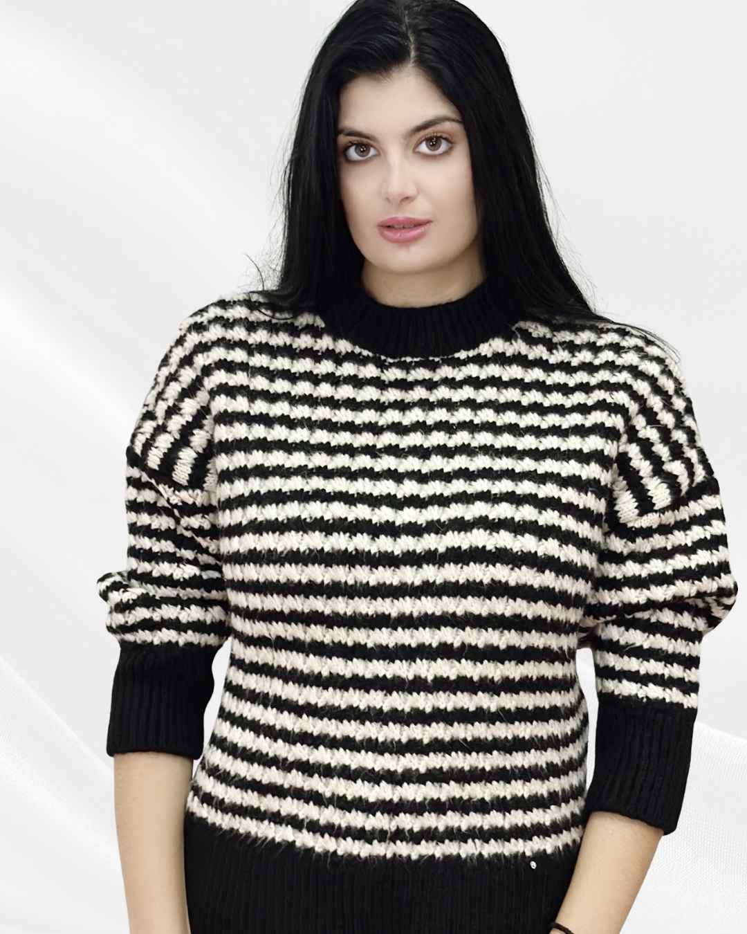 Ζεστό ριγέ πουλόβερ με διχρωμία στα λάστιχα.
