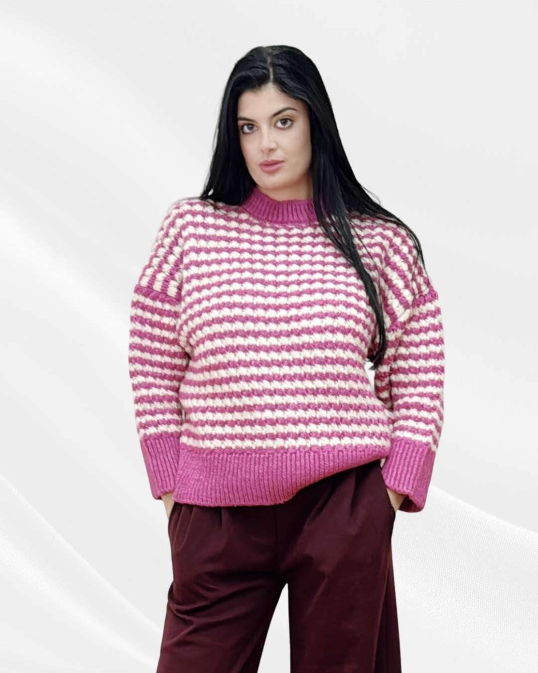 Ζεστό ριγέ πουλόβερ με διχρωμία στα λάστιχα.